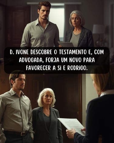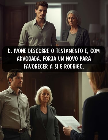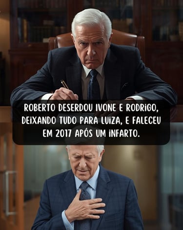 No entanto, em 2017, o destino trouxe uma tragédia: Roberto sofreu um infarto fulminante e faleceu. Durante o processo de inventário, Dona Ivone encontrou uma cópia do testamento original e, movida pela ambição, contratou uma advogada fraudulenta para forjar um novo documento, invertendo as disposições do pai — deserdando Luiza e favorecendo Rodrigo e ela própria.