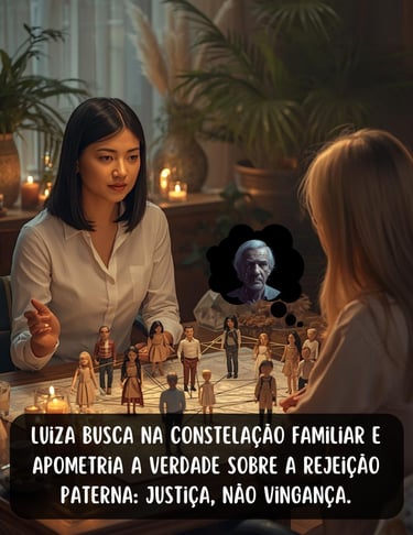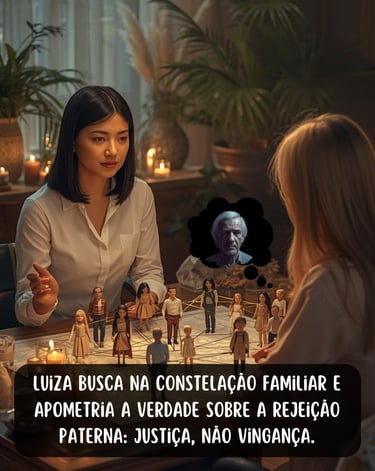 Luiza, profundamente indignada, não pela perda dos bens — pois já possuía patrimônio próprio — mas pela injustiça e o sentimento de rejeição paterna, buscou auxílio através de uma constelação familiar com apometria. Nesse trabalho energético, uma verdade essencial emergiu: o espírito de seu pai lhe pedia justiça, não vingança. A revelação trouxe clareza e acolhimento, permitindo que Luiza compreendesse os desdobramentos familiares sem se perder no ressentimento.