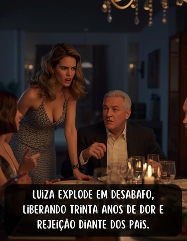 Revoltada, Luiza se levanta, dá um soco na mesa e, num impulso, despeja trinta anos de dor e rejeição diante dos pais. As palavras saem como um desabafo guardado há décadas. Sua mãe, ofendida, levanta-se e vai embora. Já o pai, senhor Roberto, fica em silêncio, abalado. No dia seguinte, ele procura Luiza.