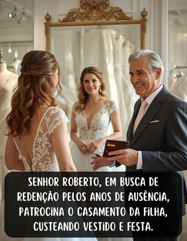 Movido pelo desejo de reparar as injustiças, o senhor Roberto insiste em custear o casamento e o vestido da filha — como uma forma simbólica de devolver o amor e o reconhecimento que ela merecia.